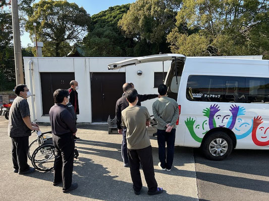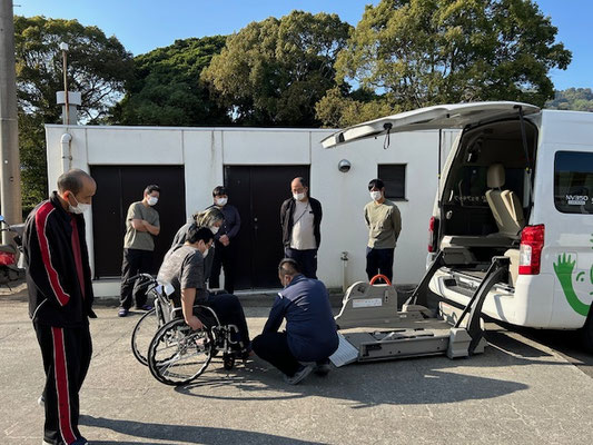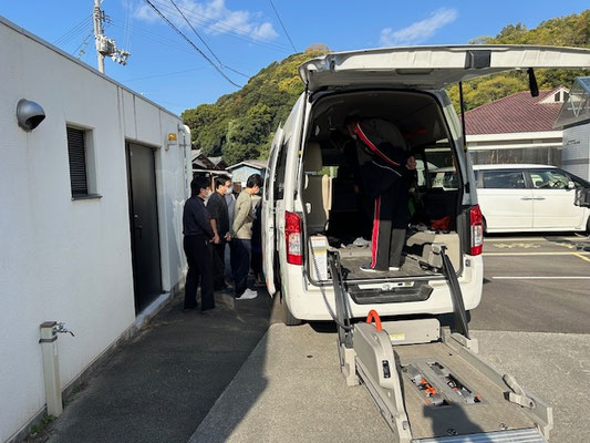 続いて、職員の指導にて緊急時の入所者の移送時を想定し福祉車両の操作の仕方を学びました。いざその時になったらそれどころではない騒ぎやパニックになっているかもしれないですが、訓練を通して日頃から対策を実施する事の大切さを学びました。