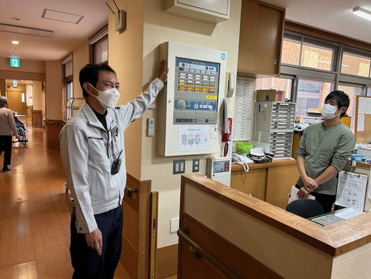 施設内の消防機器や火災報知機の点検に始まり、通報訓練も実施しました。